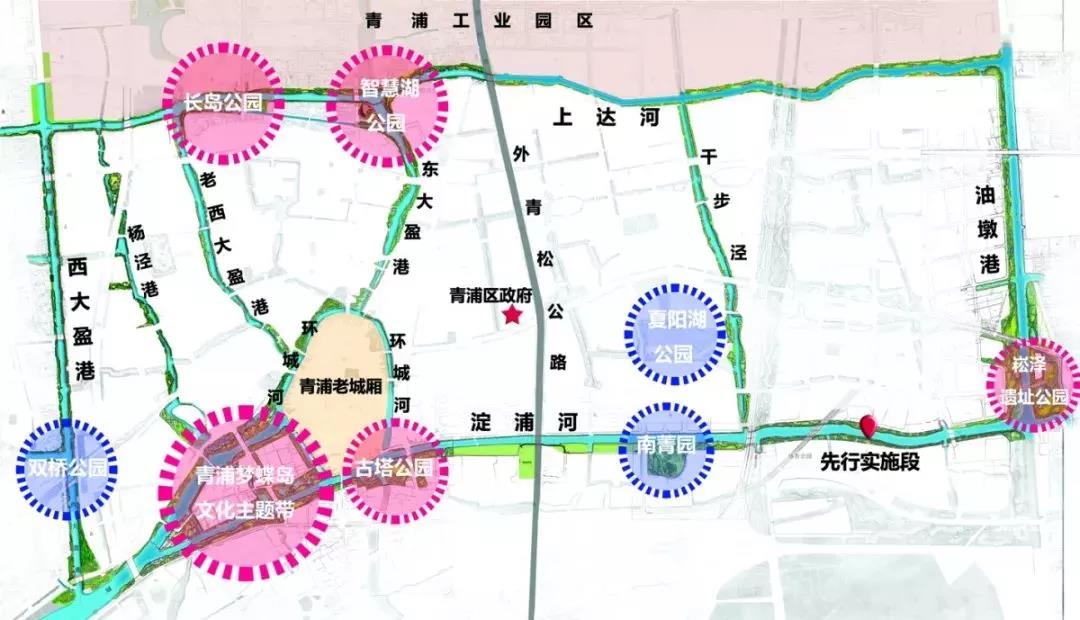 环城水系公园范围很广,淀浦河、油墩港、上达河和西大盈港等四条骨干河道大概21公里,围起来大概要24平方公里,这个区域实际上就是新城的核心区。围绕核心区里面外青松公路两侧、上达河两岸产城融合区等地块,来进一步完善新城作为“双城”定位所必须的功能。同时,对老城区功能作必要的疏解和调整,使得城市的空间布局更加合理、宜人。