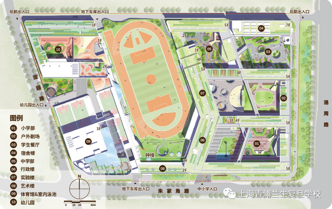 学校核心设施:综合体育馆、室内恒温游泳池、多功能室内外双向剧场、错层图书馆、风雨操场、教学楼、艺术楼、行政实验楼、宿舍、地下车库等。