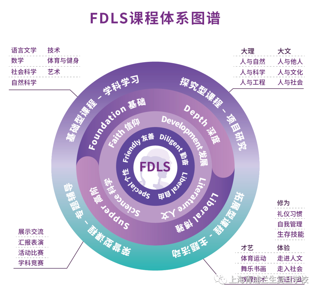 FDLS课程体系分为基础型、探究型、拓展型、荣誉型四大课程类型。“基础型”课程,重视基础学力的培养,促使学生具有宽泛的知识基础以及基本能力,特别是实验动手能力、英语语用能力等。“探究型”课程,是由我校自助开发的跨学科的大文大理课程,它面向整个生活世界,通过小组项目研究的方式,自主学习、合作探究,跨学科综合运用知识研究问题;该课程强调实践体验,使学生加深对知识的理解与应用。“拓展型”课程,突出德育贯穿教育的全过程,其中“修为”、“才艺”、“体验” 等课程推动学生由自然人成长为社会人,推进学生综合素质的发展。“荣誉型”课程,是为满足学生的发展需求、为每一个学生提供进阶机会而专设的竞赛提高课程。